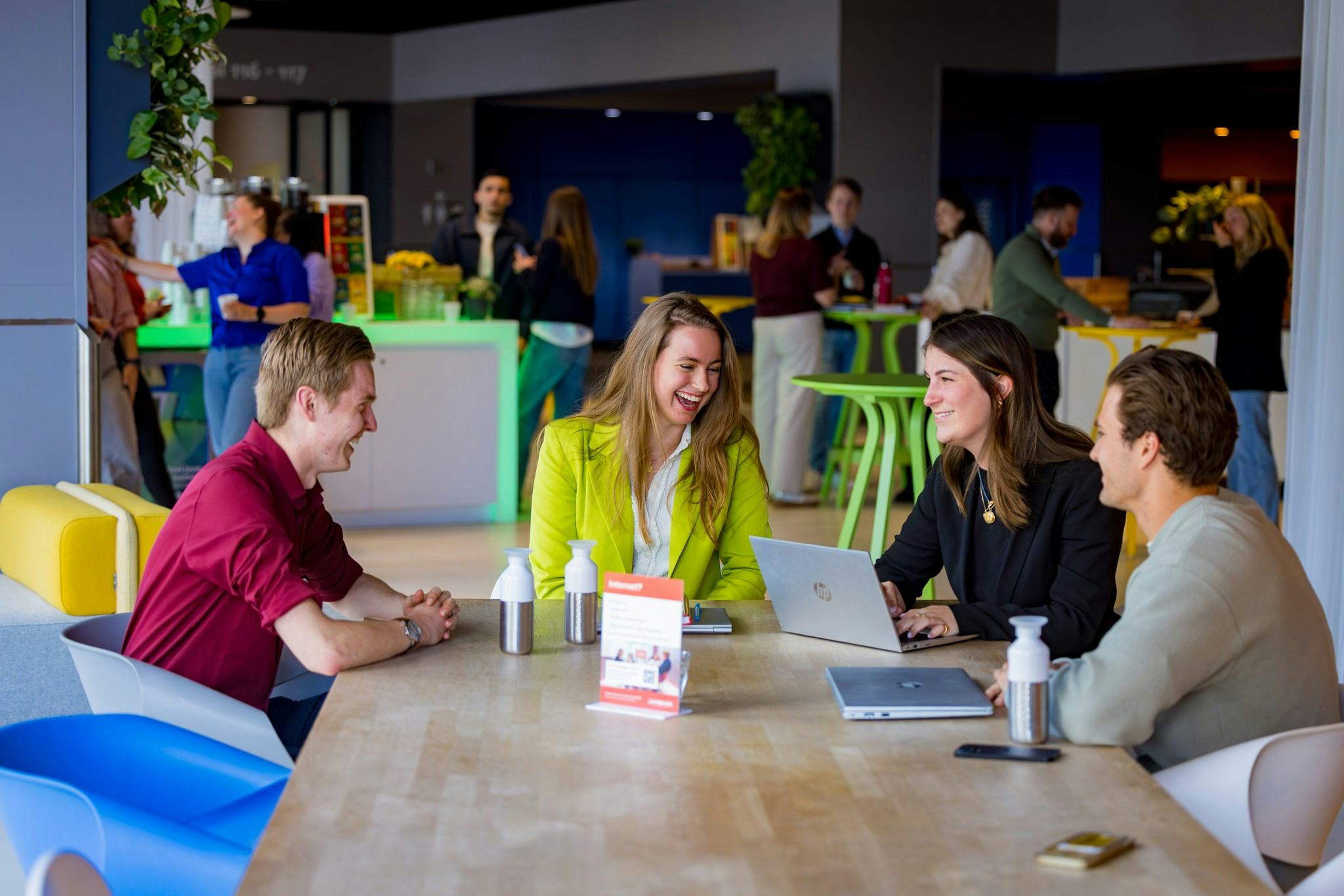 Elke verdieping heeft een centrale cateringruimte met koffieautomaten, koekjes van de Koekfabriek en vers fruit. "Daar bieden wij alle catering aan tijdens de pauzemomenten", licht Reineman toe. "Klanten vinden het fijn omdat ze dan even de benen kunnen strekken en even de ruimte kunnen verlaten waar ze al een paar uur zijn geweest. Bovendien ontstaan daar vaak spontaan informele gesprekken en is het een prettige plek om even bij te praten of te netwerken met andere deelnemers."